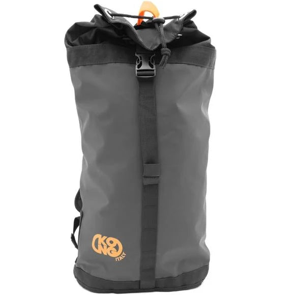 Backpack for carrying ropes and equipment with comfortable padded shoulder straps and hook for suspension. Angled closing flap with ring for the suspension which ensure a comfortable access to the contents of the bag. Drawstring closure and rapid clip made of ultra-durable nylon. Transparent side pocket for name plate label. Interior pocket with zip for storing small tools. Made of extremely durable PVC; reinforced bottom with slotted holes for breathability and handle for the emptying. Available in two sizes: